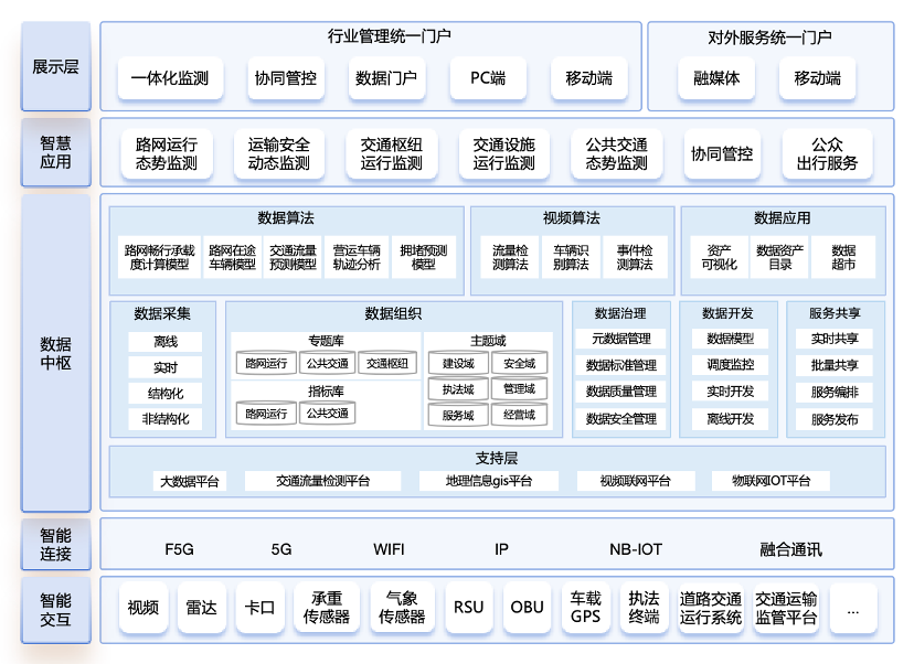 3. Data Hub: Mainly includes: Data algorithms: road network capacity calculation model, en-route vehicle model, traffic flow prediction model, operational vehicle trajectory analysis, congestion prediction model; Video algorithms: traffic flow detection algorithm, vehicle recognition algorithm, event detection algorithm; Data applications: asset visualization, data asset catalog, data marketplace; Data management: data collection, organization, governance, development, and service sharing; Support layer: big data platform, traffic flow monitoring platform, GIS platform, video networking platform, Internet of Things (IoT) platform.