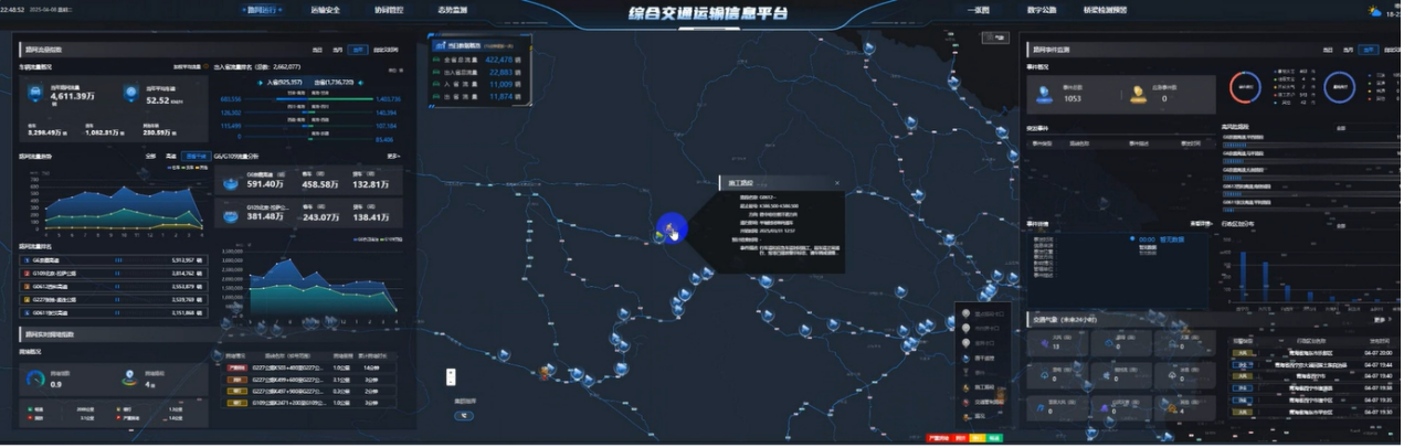 The platform integrates road network information across the entire province, covering all transportation data, and accurately calculates inter-provincial traffic flows (inbound and outbound) as well as passenger and freight vehicle flows, addressing previous inaccuracies in inter-provincial traffic statistics. It enables dynamic monitoring of chartered tourist coaches, intercity coaches, and specialized vehicles for transporting dangerous chemicals, fireworks and explosives across the provincial road network. Based on aggregated and analyzed traffic data, the platform predicts the road network’s operational status for short-term, monthly, quarterly, and annual intervals. By integrating external data sources—such as meteorology, public security, and emergency management—the platform can also monitor and forecast the road network’s carrying capacity in real time, enabling congestion point management, real-time updates on traffic efficiency, major traffic accidents, and blockages at key nodes.