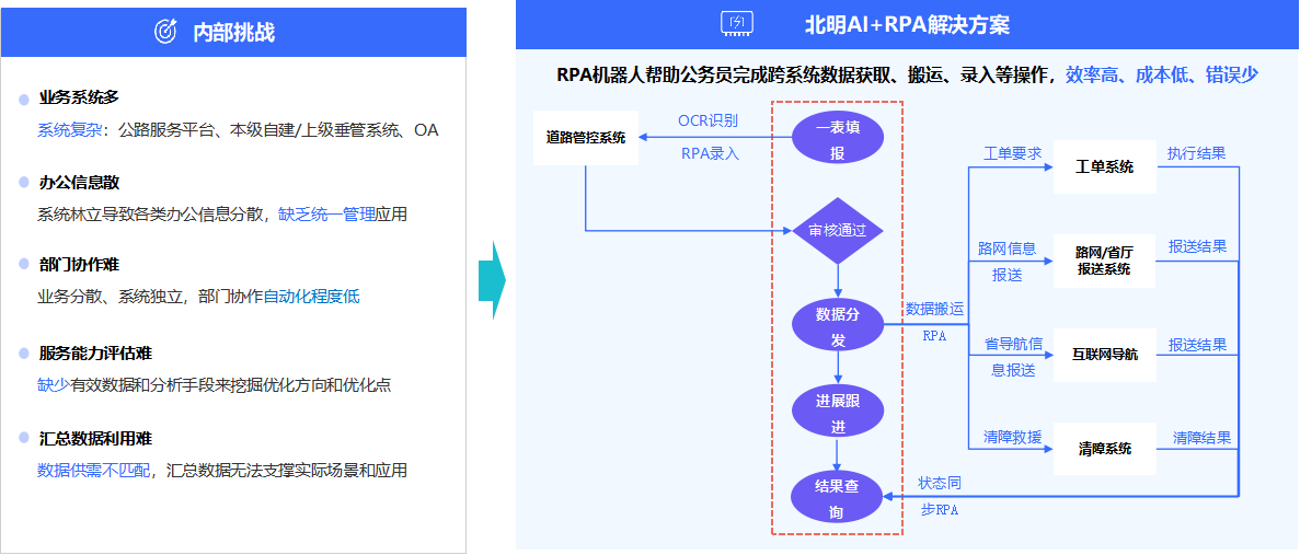 Given the characteristics of daily expressway operations and reporting processes, the RPA (Robotic Process Automation) robot replaces manual tasks with automated operations. It assists staff in handling large, repetitive, and standardized tasks related to multi-system reporting and monthly reports, achieving 90% workload automation. This solution reduces the high error rate associated with manual data entry, improves work efficiency, and lowers labor costs.