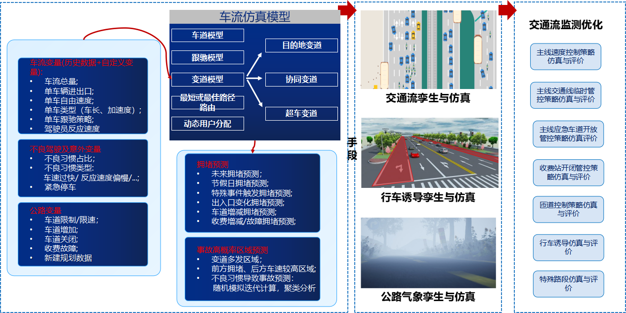 High-speed traffic flow monitoring includes the simulation and evaluation of the mainline speed control strategy, the simulation and evaluation of the mainline traffic line temporary control strategy, the simulation and evaluation of the mainline emergency lane opening control strategy, the simulation and evaluation of the toll station opening and closing control strategy, the simulation and evaluation of the ramp control strategy, the driving induction simulation and evaluation, the simulation and evaluation of special road sections, etc. The expressway traffic flow is monitored and sensed in all directions, and optimization strategies are generated based on the traffic situation to maximize the road traffic capacity, achieve the balanced matching of the supply and demand of the road network, avoid congestion aggregation, and ensure the fast passage of high-speed road network traffic flow.