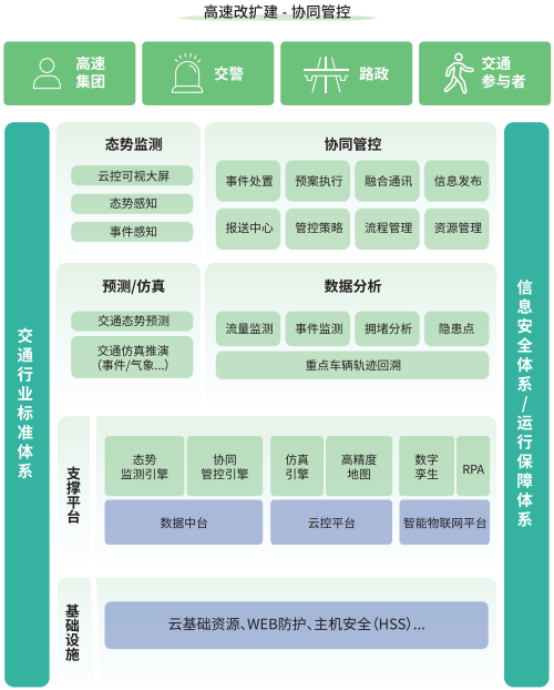 The smart expressway collaborative management and control platform uses advanced wireless communication and new-generation Internet and other technologies to gather expressway information resources. It enables expressway traffic operation monitoring and early warning, operation coordination and command, video image analysis, and comprehensive information processing. The platform supports comprehensive scientific decision-making for the government, expressway managers, and operation and maintenance personnel, provides comprehensive operation management for enterprises, and offers comprehensive traffic information services for citizens. The platform enhances the safety guarantee capabilities of expressways, minimizes potential accident risks, reduces the severity of accidents, ensures all-weather access to expressways, guarantees traffic safety, improves traffic efficiency, and builds a safe, efficient, and environmentally friendly traffic system.